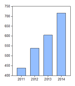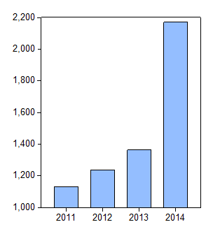 圖1:2011-2014泰州工業增加值(億元)