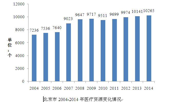 北京是我國醫療衛生資源最為密集的地區之一。2014年末,全市醫療衛生機構數達10265家(包含15家駐京部隊醫療機構),其中醫療機構10107家(含89家三級醫療機構、147家二級醫療機構以及600家一級醫療機構),其他衛生機構158家。除擁有為數眾多的綜合醫院外,北京有口腔、眼科、腫瘤、心血管等各類專科醫院,各類醫院平均治愈率近60%,大多數專科醫院病人治愈率更是超過90%,高于全國平均水平。