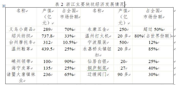 浙江是我國產業集群最為密集的地區。據浙江省經貿委調查,2003年浙江省工業總產值在10億元以上的制造業“塊狀經濟”有149個,工業總產值合計1萬億元,約占全省總量的50%(董樹榮,2005)。其中,較典型的有溫州鞋革和服裝、紹興(縣)印染和織造、樂清低壓電器、蕭山化纖、海寧皮革、嵊州領帶、永康五金、永嘉紐扣、桐廬制筆、諸暨襪業等。目前,這些“塊狀經濟”已經成為浙江省乃至全國的專業生產加工出口基地。例如,溫州市區打火機產量占世界的70%;嵊州領帶產量占全國的80%、占世界領帶市場的30%;永康衡器產量占全國的2/3;蒼南鋁制徽章的國內市場占有率高達45%;海寧許村、許巷的裝飾布占全國市場份額的35%以上;樂清柳市的低壓電器在全國的市場占有率超過1/3。從表2中可以看出,浙江省一些主要塊狀經濟(或產業集群)占全國的市場份額都很大,其中義烏小商品、嵊州領帶、諸暨大唐鎮襪業、永康五金、溫州打火機、永嘉橋頭鎮鈕扣等都超過50%,而紹興紡織、寧波服裝、溫州鞋革、臺州摩托車、義烏小商品、永康五金、諸暨大唐鎮襪業等的產值規模則超過200億元。