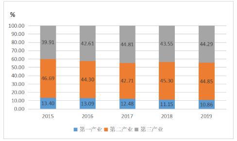 2015-2019年三次產(chǎn)業(yè)增加值占國(guó)內(nèi)生產(chǎn)總值比重