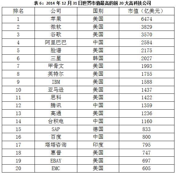 (2)從市值總額上,美國(guó)遙遙領(lǐng)先,高科技企業(yè)總市值高達(dá)23122億美元,中國(guó)緊隨其后,1379.4億美元;英國(guó)位列第三,為486.14億美元;以色列位于第四名,131.71億美元;日本、德國(guó)相對(duì)較弱。