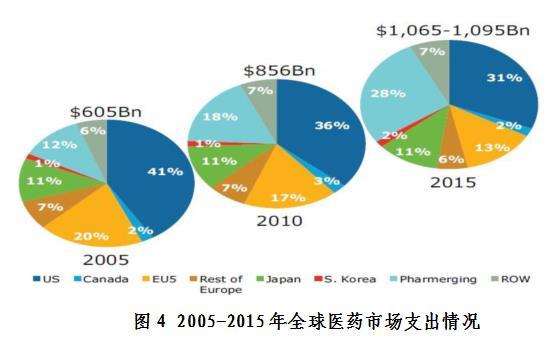 到2015年,美國占國際醫(yī)藥市場支出的份額將從2005年的41%下降到31%,而位于國際醫(yī)藥市場支出份額第五名的歐洲的國家也將從20%下降到13%。同時(shí),17%高增長新興市場將有中國引領(lǐng),到2015年它所占份額將從2005年的12%上升到28%。(數(shù)據(jù)來源:IMS Market Prognosis, Apr 2011)