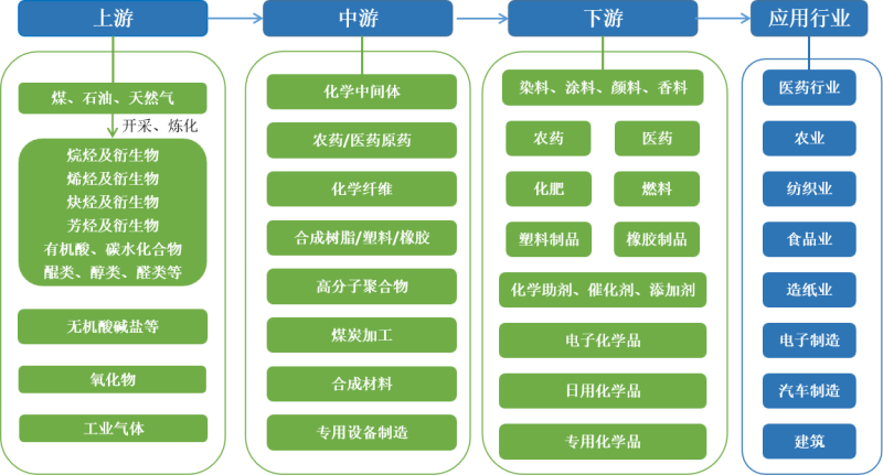 石化產業鏈上游涉及石油、天然氣、煤、無機鹽礦等開采,中游涉及基礎化學原料、化學中間體、合成纖維、合成橡膠等以及衍生品的生產,下游涉及農藥、化肥、醫藥、電子化學品、化學助劑、日用化學品等終端產品制造。