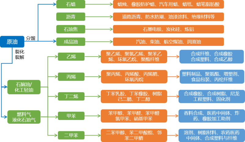 ——石油化工產業鏈。原油經過分餾、熱裂解、催化重整等工藝,生產燃料油、潤滑油、液化石油氣、石油焦碳、石蠟、瀝青等石油產品,及乙烯、丙烯、丁二烯、苯、甲苯、二甲苯為代表的基本化工原料,再合成塑料、纖維、橡膠、樹脂等下游產品。