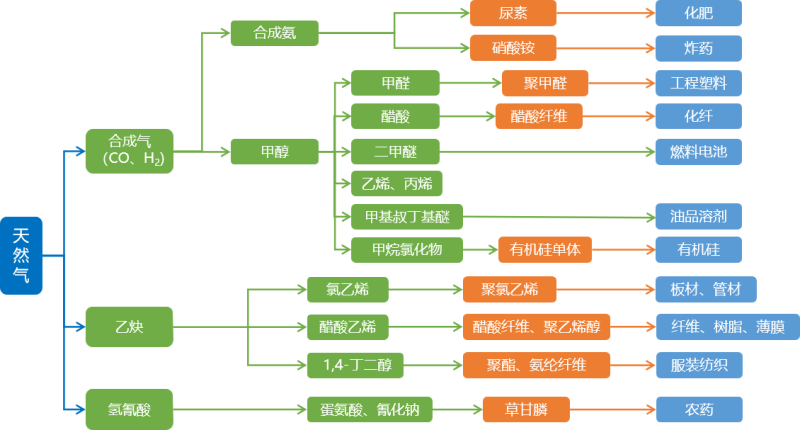 ——天然氣化工產業鏈。以天然氣為原料,通過凈化分離、裂解、氯化、硫化、脫氫等反應,生產合成氨、甲醇、乙炔、氫氰酸等基本化工原料,再合成尿素、草甘膦等化肥農藥、塑料、纖維、橡膠、樹脂、有機硅、化學溶劑等產品。