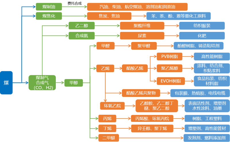 ——現代煤化工產業鏈。煤化工是以煤為原料,經過化學加工生產多種清潔燃料和基礎化工原料的產業,包括煤制油、煤制天然氣、低階煤分質利用、煤制烯烴、煤制乙二醇等煤制化學品以及煤基新材料。