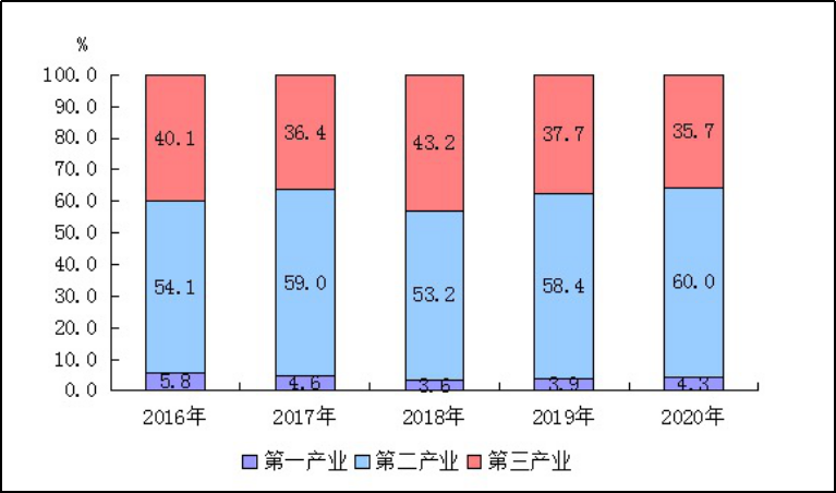 圖2 2016年-2020年陽城縣三次產業結構情況